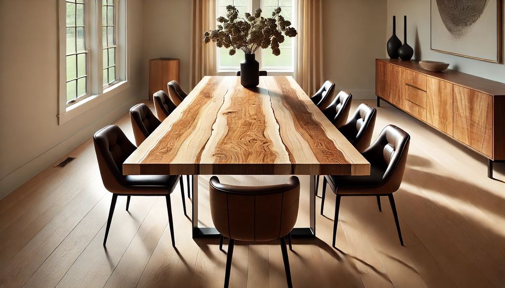 This handcrafted maple table showcases the beauty of clean lines and subtle grain. Made from carefully glued 4-inch-wide planks, its smooth blonde surface highlights the timeless elegance of maple wood. Perfectly balanced with sleek black metal legs, this table blends modern design with classic craftsmanship, making it a versatile centerpiece for any space.