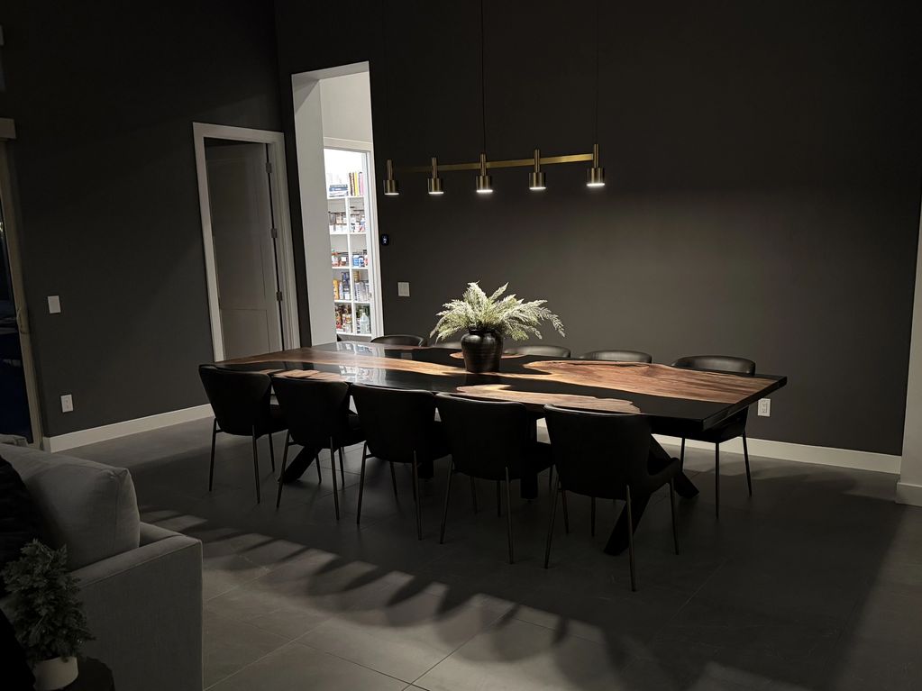 A striking combination of natural black walnut and sleek black epoxy, this custom-made table is the perfect blend of elegance and craftsmanship. Its bold design and impeccable finish make it a true statement piece, built to transform any space with timeless sophistication.